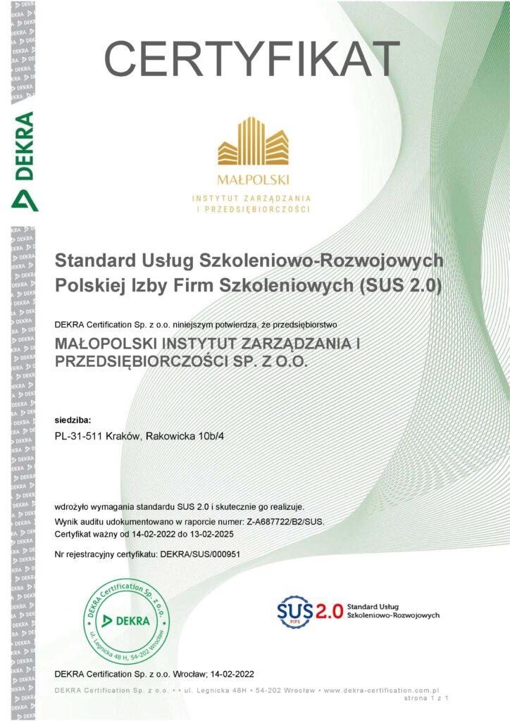 Małopolski Instytut Zarządzania i Przedsiębiorczości to renomowana instytucja szkoleniowa, specjalizująca się w organizacji szkoleń dla osób prywatnych, firm i instytucji. Jesteśmy zarejestrowani w Rejestrze Instytucji Szkoleniowych pod numerem 2.12/00042/2021, co potwierdza nasze zaangażowanie w rozwój kompetencji zawodowych i osobistych naszych klientów. Jako członek Polskiej Izby Firm Szkoleniowych oraz posiadacz certyfikatu jakości SUS 2.0 (nr DEKRA/SUS/000951), gwarantujemy najwyższe standardy w realizacji naszych usług.
